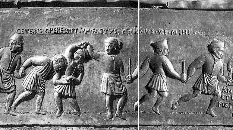 En la cara interior de la puerta, en la región inferior, el Filarete dejó su firma. Se trata de un rectángulo horizontal de 123cm por 22cm de altura. Allí representa en relieve a dos caballeros, y, en medio de ellos, a siete hombres danzando. Uno de ellos, el que parece más viejo, tiene una inscripción que reza: «ANTONIVS ET DISCIPVLI MEI», esa es la firma. Cada uno de los siete hombres está identificado. Encima de las figuras, como título de la escena, se lee la siguiente frase en relieve: «CETERIS · OPERE · PRETIVM · FASTVS · FVMVS · VE · MIHI · HILARITAS». Teniendo en cuenta el largo tiempo de ejecución, y las dificultades en ser pagado, podría traducirse como «A otros se pague la obra con el honor y con el humo; a mí con la alegría», o bien: «A los otros la ganancia de la obra, y el honor y el humo, a mí la alegría»[2]. Y es que, volviendo a Yepes, el Filarete consiguió superar lo mecánico de diseñar una puerta para danzar, para jugar mientras estaba diseñándola. Y eso es algo muy serio. «Si la vida humana es una alternancia de juego y trabajo, jugar más significa elevar el trabajo por encima de sí sin desnaturalizarlo: “jugarlo respecto de Dios”, es decir, santificarlo. Santificar el trabajo es convertir el trabajo en juego, pero no al revés».[3]